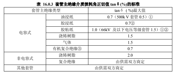 2.應(yīng)在分閘狀態(tài)下測(cè)量每只套管的 tanδ 。當(dāng)測(cè)得值超過(guò)標(biāo)準(zhǔn)時(shí),應(yīng)卸下油箱后進(jìn)行分解試驗(yàn),此時(shí)測(cè)得的套管的 tanδ (%)值,應(yīng)符合本標(biāo)準(zhǔn)表 16.0.3 的規(guī)定。