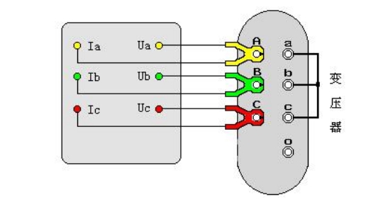 容量測(cè)試儀配有三把測(cè)試鉗(黃、綠、紅),每只鉗子分別引出兩根測(cè)試線,一根粗線、一根細(xì)線,粗線接到儀器面板上容量測(cè)試端子對(duì)應(yīng)顏色的電流端子(Ia、Ib、Ic),細(xì)線接到儀器面板上容量測(cè)試端子對(duì)應(yīng)顏色的電壓端子(Ua、Ub、Uc),將鉗頭按顏色分別夾在被試變壓器的高壓側(cè)各相接線柱上,變壓器的低壓側(cè)要用專用短接線良好短接。如圖所示: